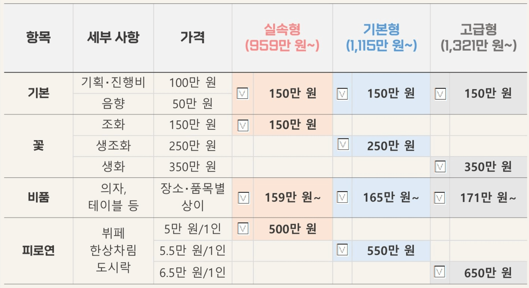 예식장 대여료를 제외한 진행비, 음향, 꽃, 비품, 피로연은 따로 결혼업체와의 상담을 통하여 선택하시게 됩니다. 다만, 가격이 표준가격표로 정해져 있기에 사정에 알맞게 선택하시면 되겠습니다.